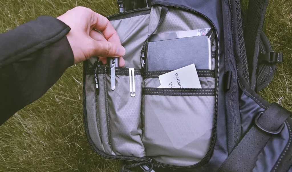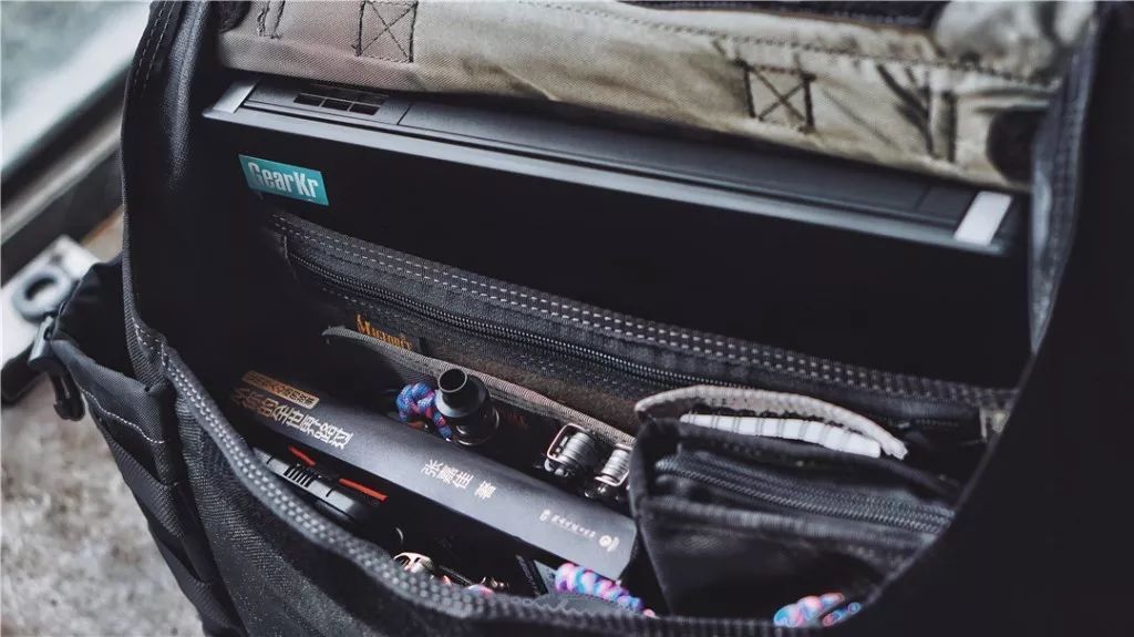 背包的下半部分则是隐蔽式拉链侧袋,两个侧袋可以看到内部分割是完全不同,左侧像0820手包一样可以存放证件、小型的手帐、笔一类的物品。